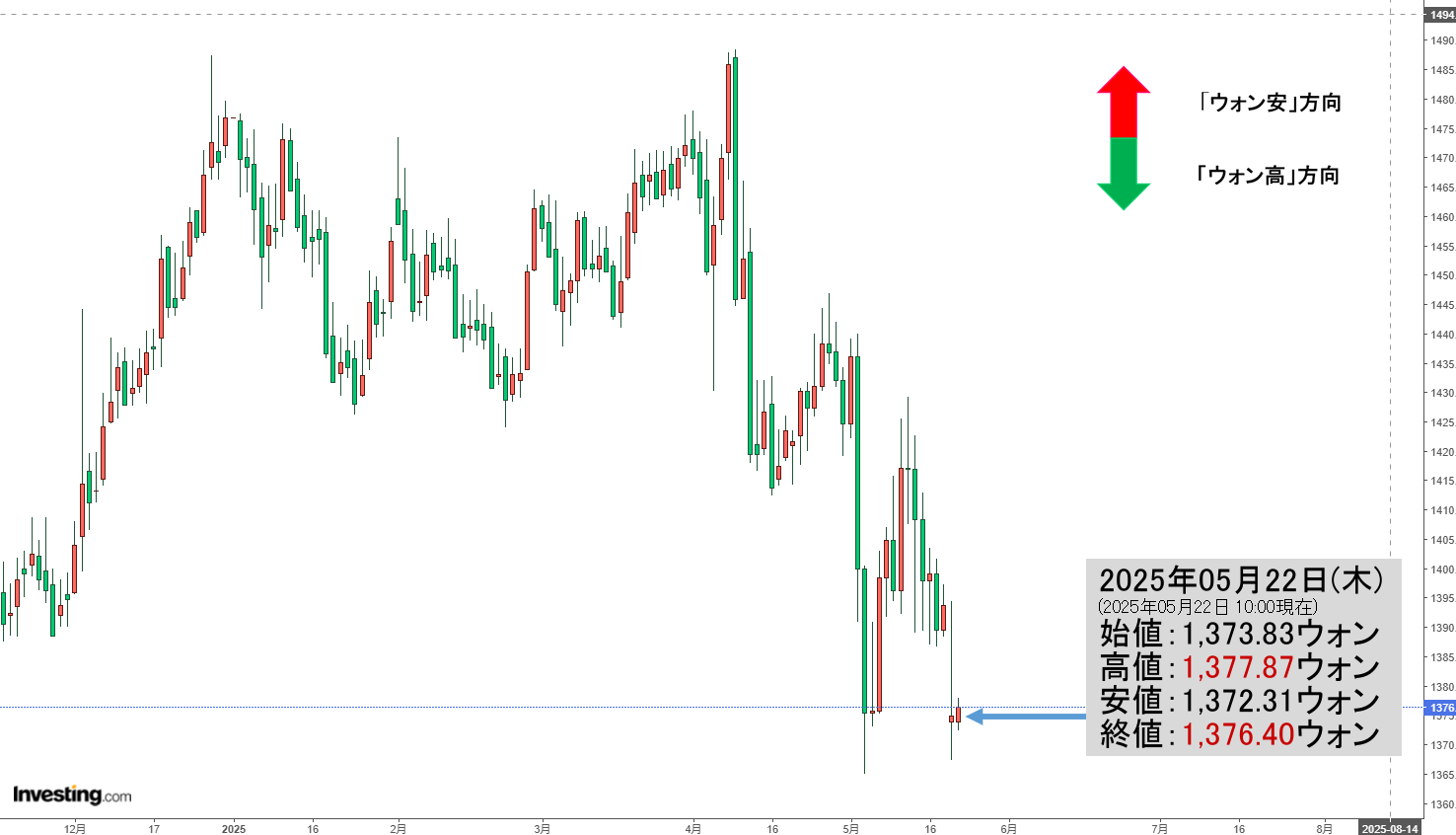 2025年05月22日(木)15:30現在、ドルウォンのチャートは以下のようになっています(チャートは『Investing.com』より引用)。陽線が伸びました。現在のところ「1ドル=1,380ウォン」近辺の攻防となっています。キリ番を巡る...
