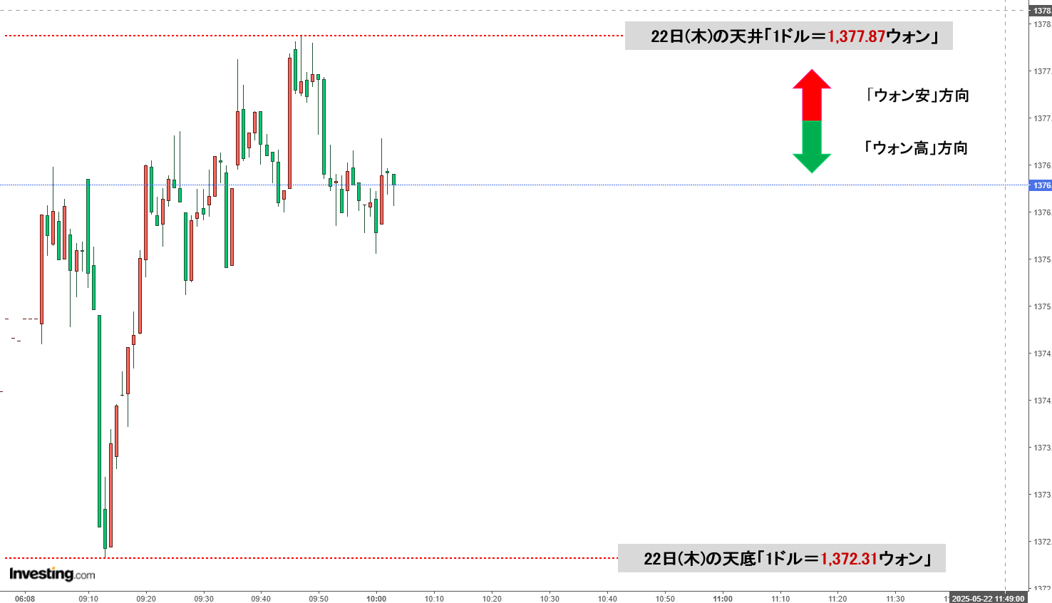 2025年05月22日(木)の市場が開きました。10:00現在、ドルウォンのチャートは以下のようになっています(チャートは『Investing.com』より引用)。