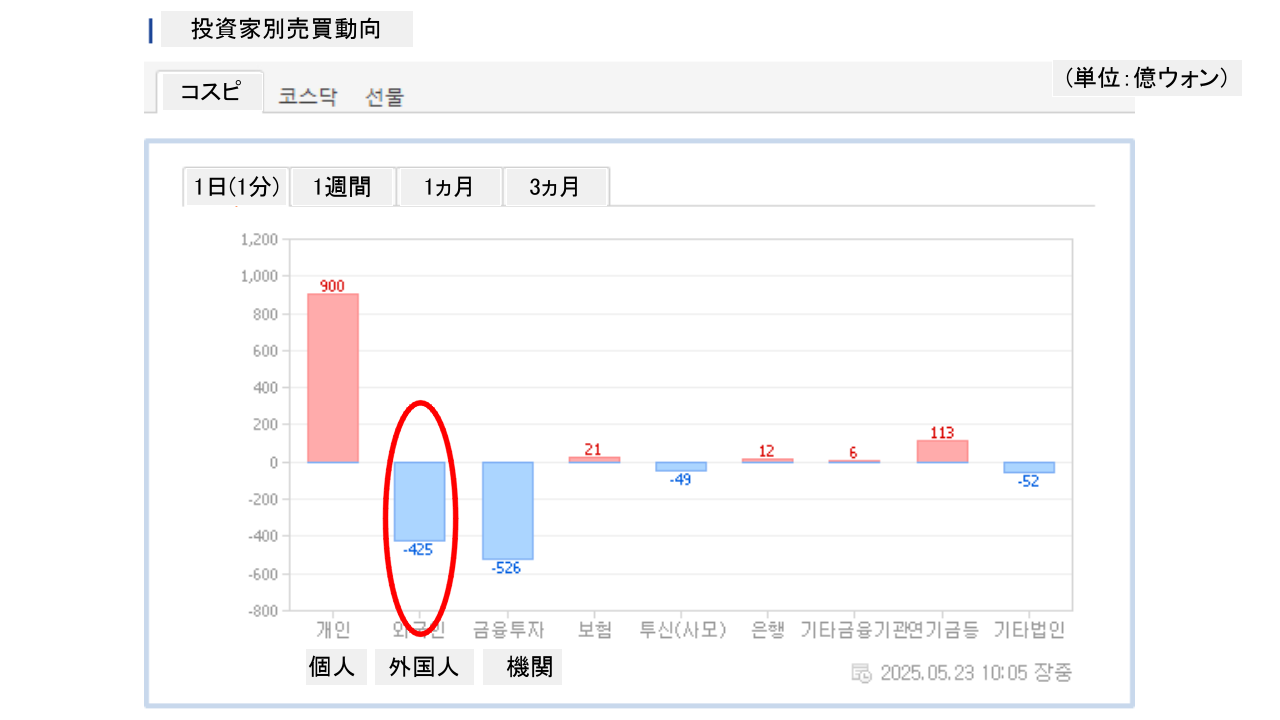 個人投資家は「900億ウォン」の買い越し。一方の外国人投資家は「425億ウォン」の売り越しです。