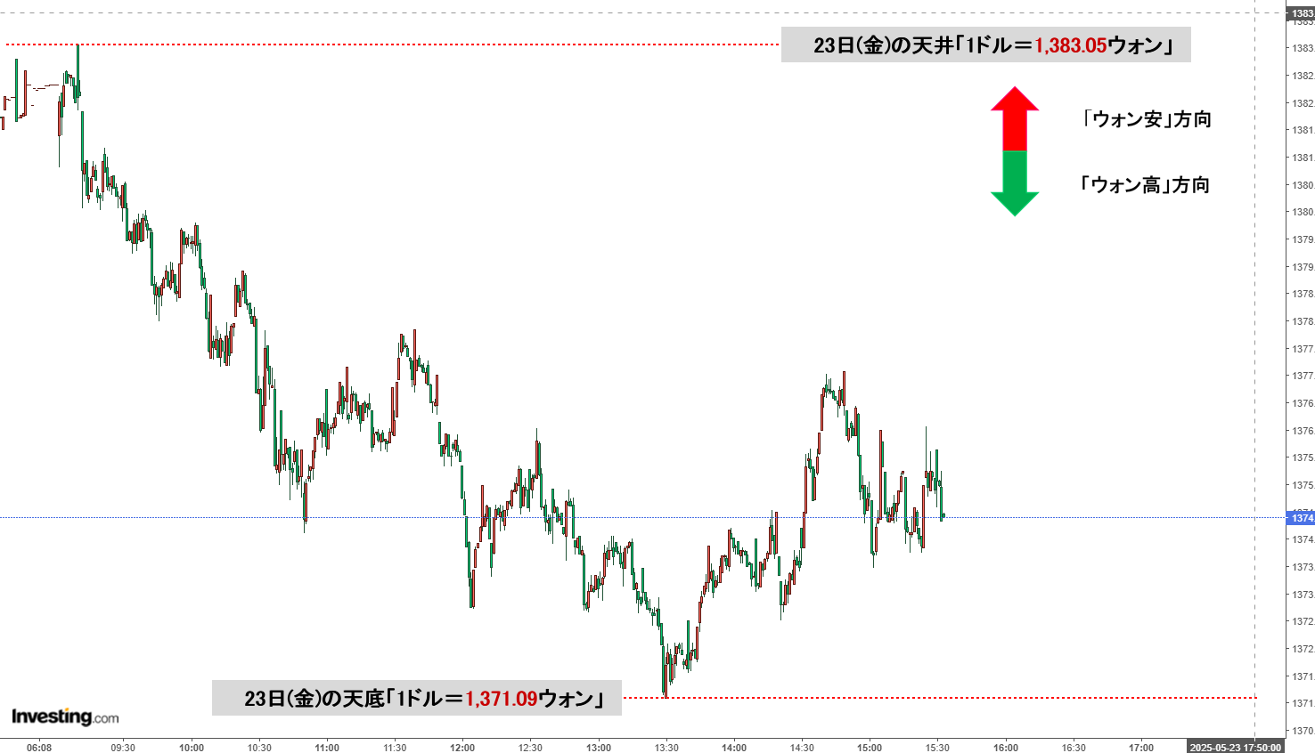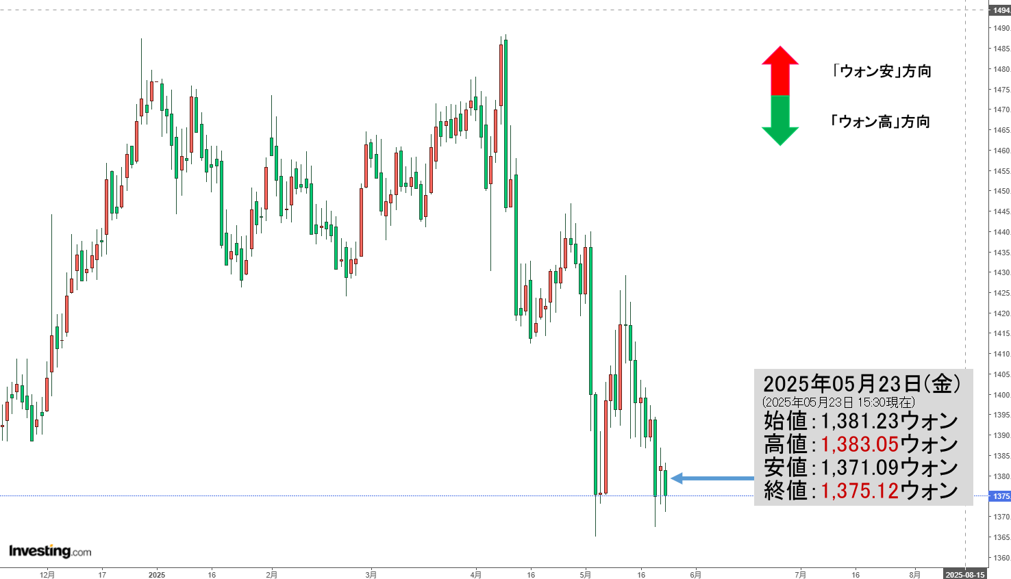 2025年05月23日(金)が(ほぼほぼ)締まりました。2025年05月24日 06:02現在、ドルウォンチャートは以下のようになっています(チャートは『Investing.com』より引用:以下同)。ローソク足1本が1分間の値動きを示す「…