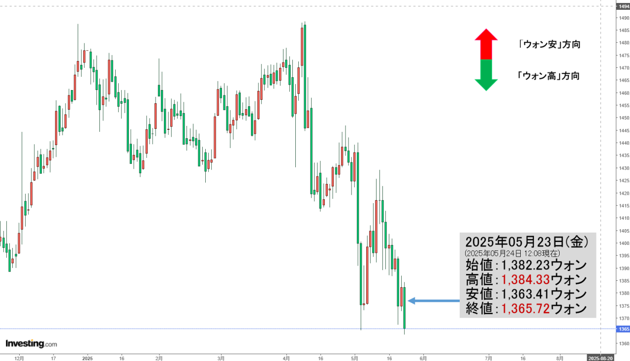2025年05月23日(金)が(ほぼほぼ)締まりました。2025年05月24日 12:11現在、ドルウォンチャートは以下のようになっています(チャートは『Investing.com』より引用:以下同)。