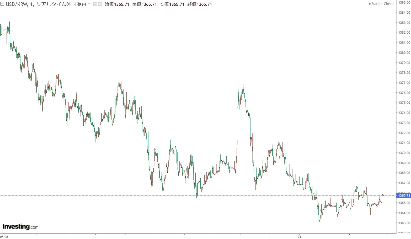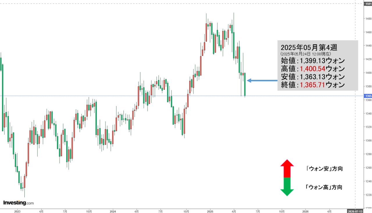 2025年05月26日(月)の市場が開きました。10:00現在、ドルウォンのチャートは以下のようになっています(チャートは『Investing.com』より引用)。下げて始まりましたが、現在のところ陽線。「1ドル=1,368ウォン」近辺の攻...