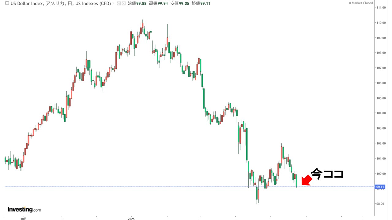 2025年05月23日(金)終値は、100を割って「99.17」。これは2022年04月以来、3年ぶりの低水準です。