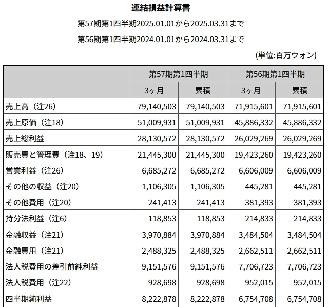 2025年05月15日、『サムスン電子』の2025年第1四半期の業績を公示しました。以下をご覧ください。