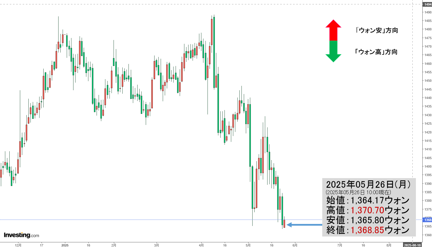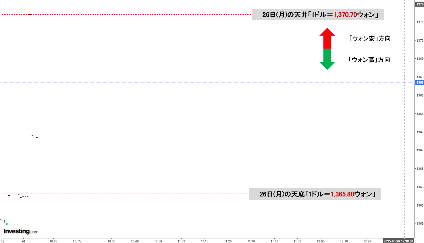 2025年05月26日(月)の市場が開きました。10:00現在、ドルウォンのチャートは以下のようになっています(チャートは『Investing.com』より引用)。
