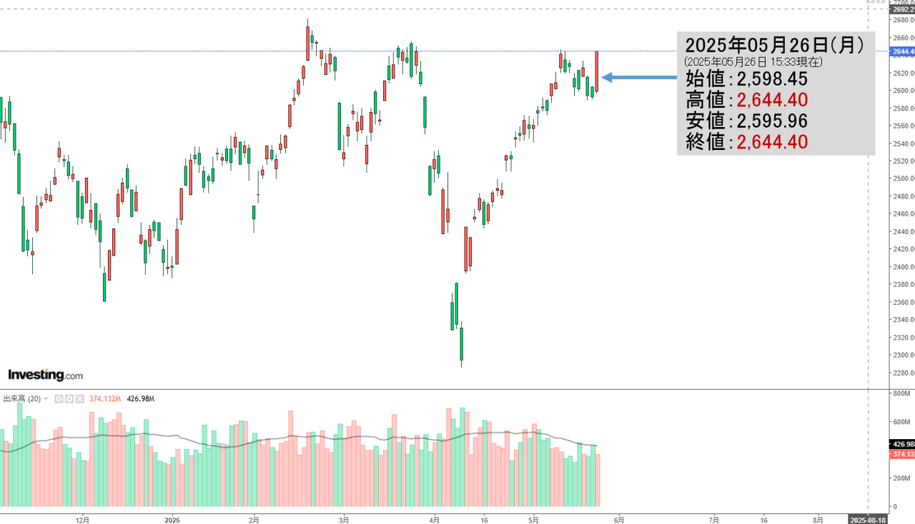 2025年05月26日(月)の韓国株式市場が締まりました。15:33現在、KOSPI(韓国総合株価指数)のチャートは以下のようになっています(チャートは『Investing.com』より引用)。