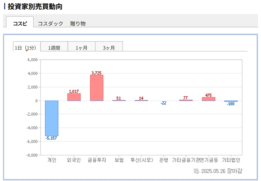 個人投資家は「5,157億ウォン」の売り越し。一方の外国人投資家は「1,017億ウォン」の買い越しです。