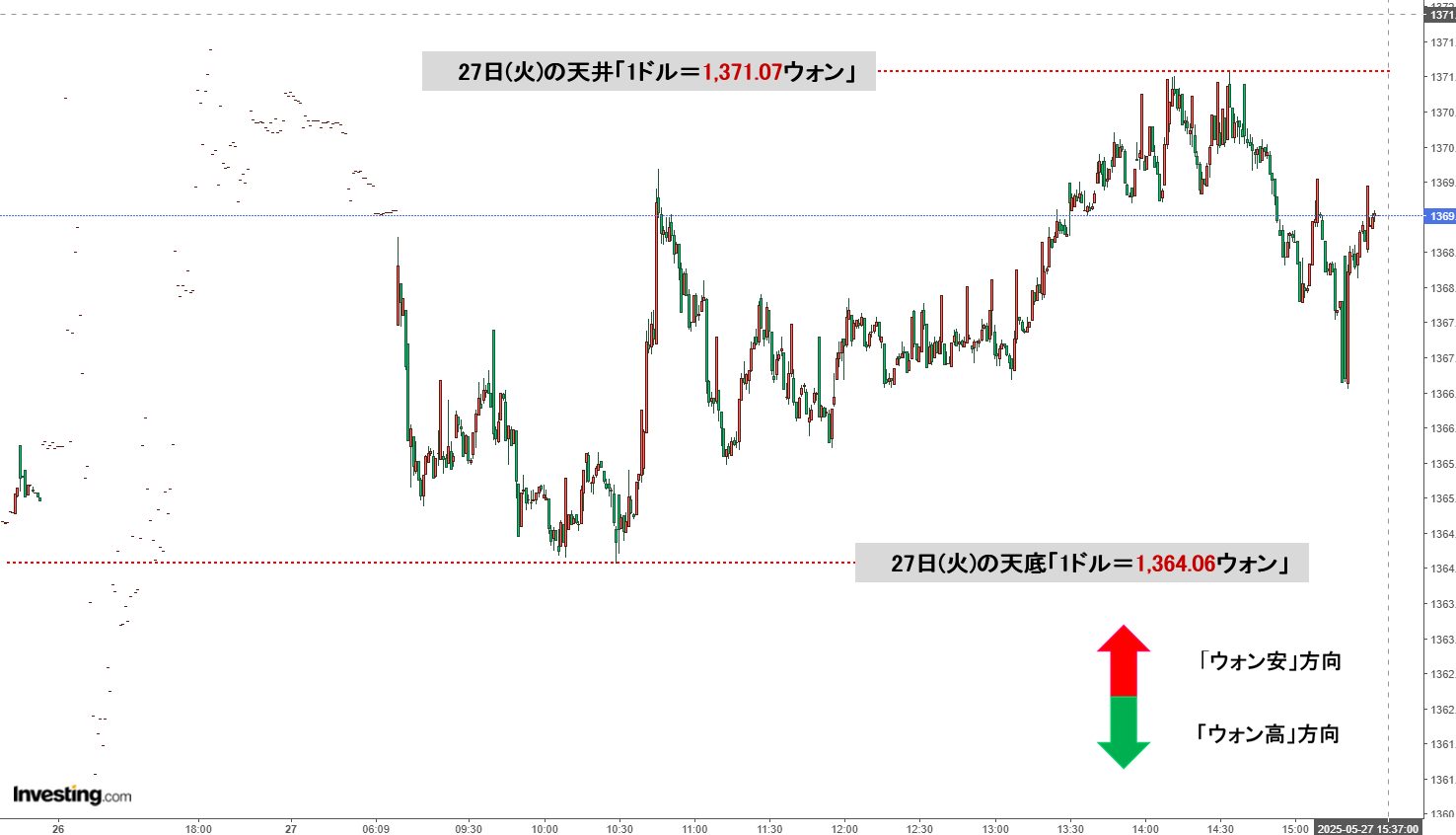現在の天井は「1ドル=1,371.07ウォン」、天底は「1ドル=1,364.06ウォン」です。