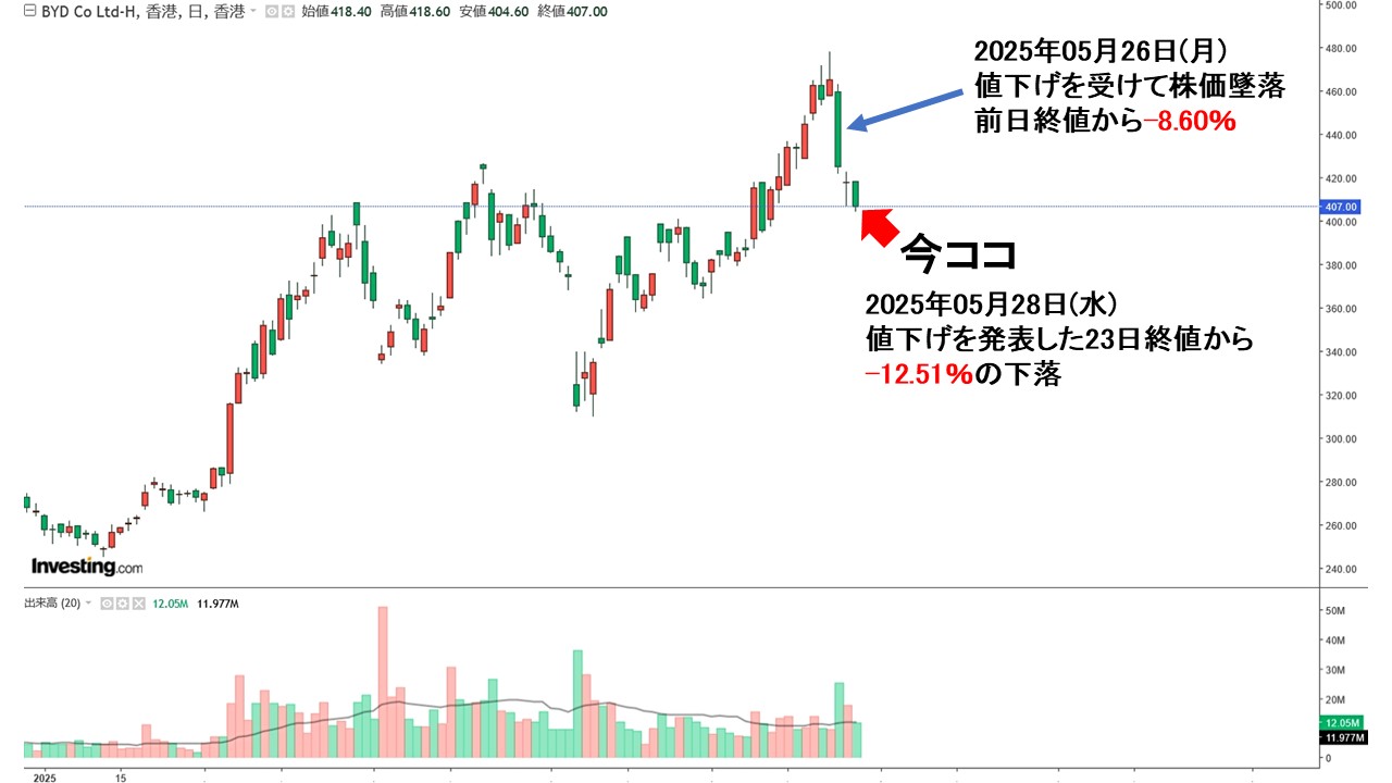 『BYD』が値下げを発表したのは23日(金)。週が開けて26日(月)、『BYD』の株価は墜落しました。以下をご覧ください(チャートは『Investing.com』より引用:以下同)。