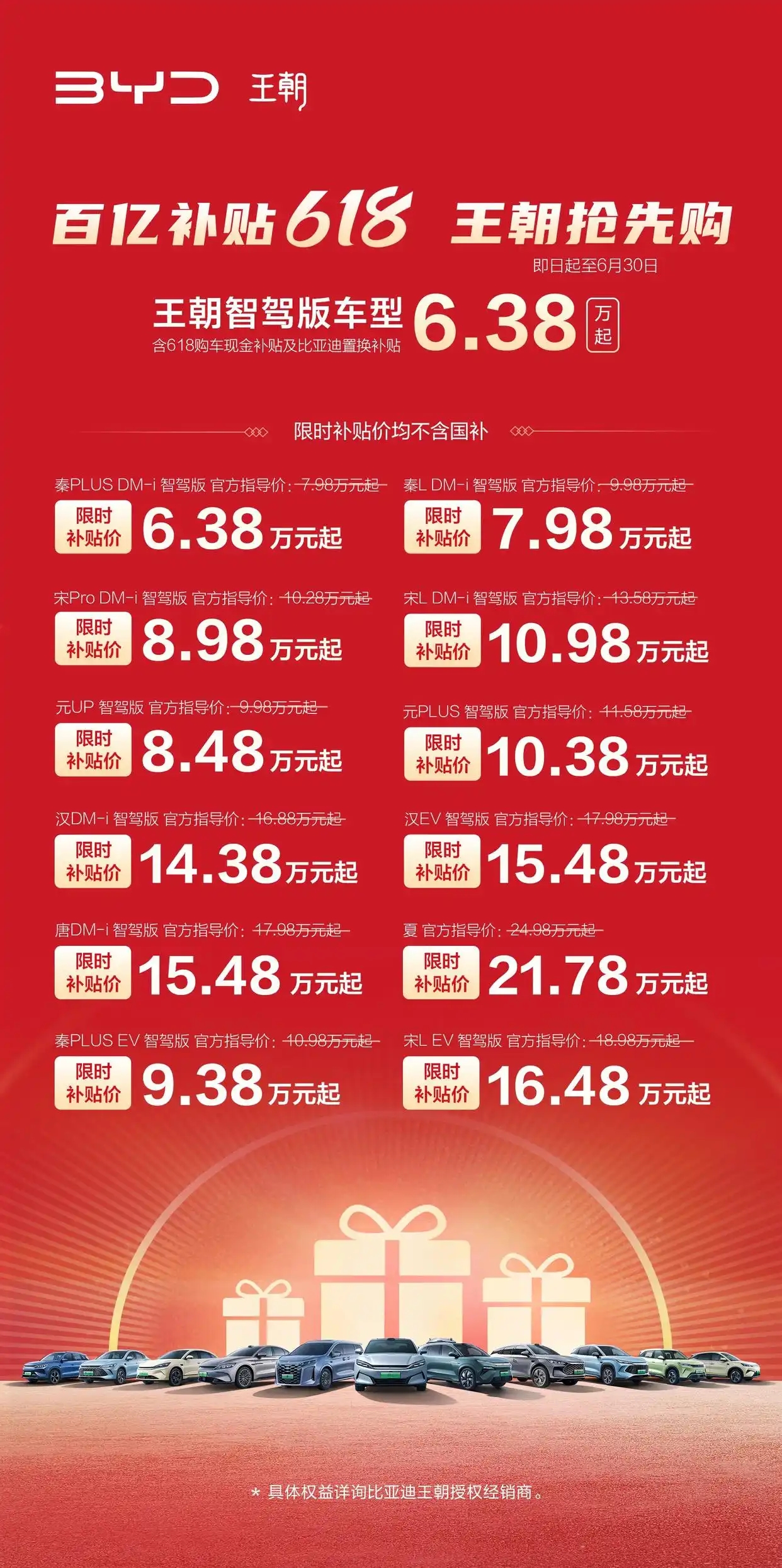 期間限定の「ワンプライス」または期間限定補助金のプロモーションで、「王朝シリーズ」「海洋シリーズ」ブランドの計22車種、スマートドライブ版(智駕版)モデルが対象です。