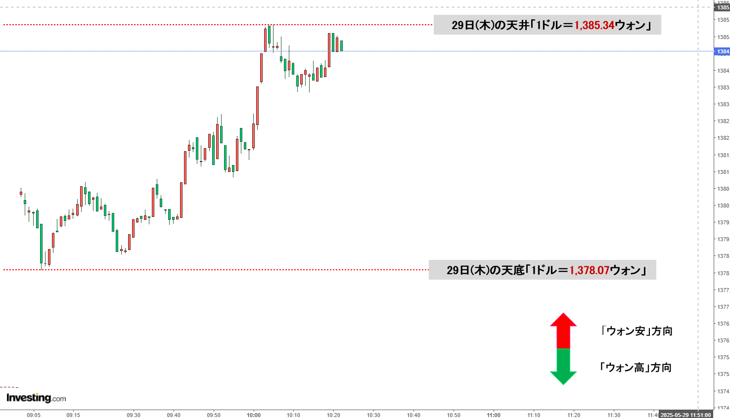 2025年05月29日(木)の市場が開きました。10:19現在、ドルウォンのチャートは以下のようになっています(チャートは『Investing.com』より引用)。