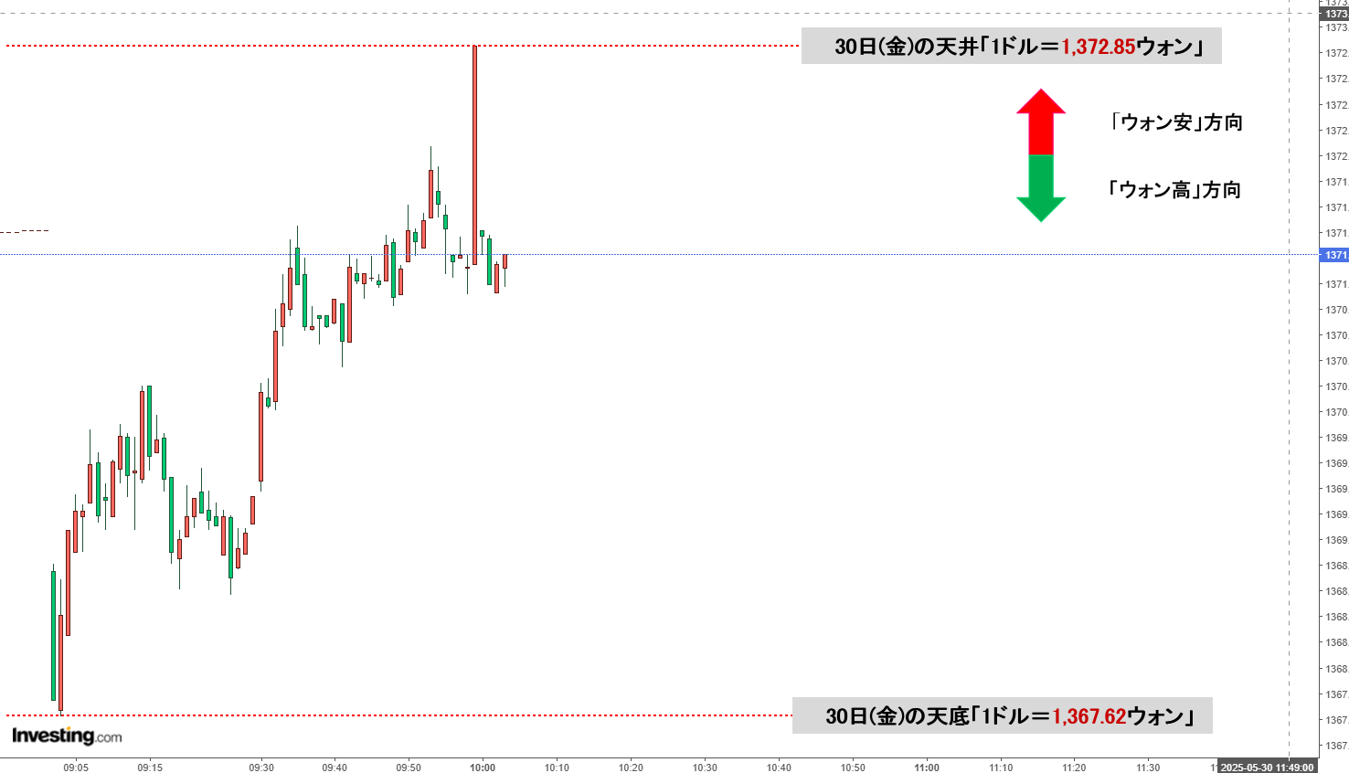 2025年05月30日(金)の市場が開きました。10:00現在、ドルウォンのチャートは以下のようになっています(チャートは『Investing.com』より引用)。