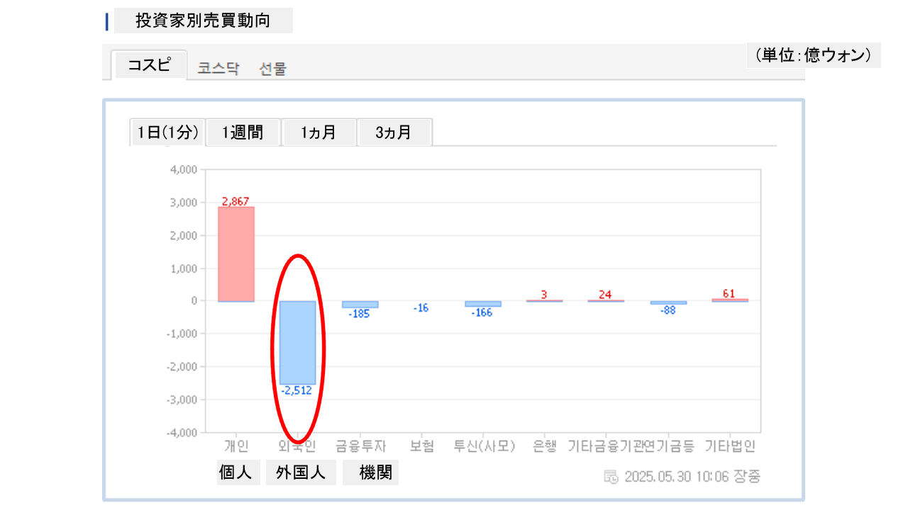 個人投資家は「2,867億ウォン」の買い越し。一方の外国人投資家は「2,512億ウォン」の売り越しです。