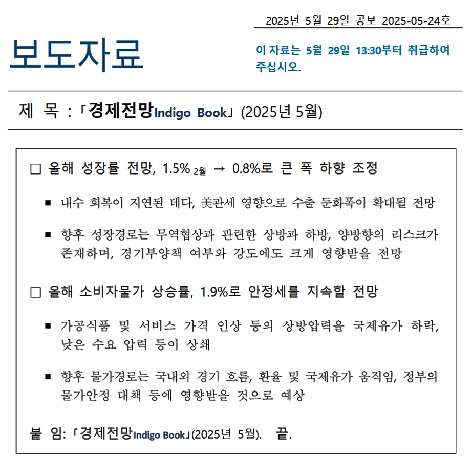 2025年05月29日、『韓国銀行』が「経済展望(2025年05月)」を公表しました。