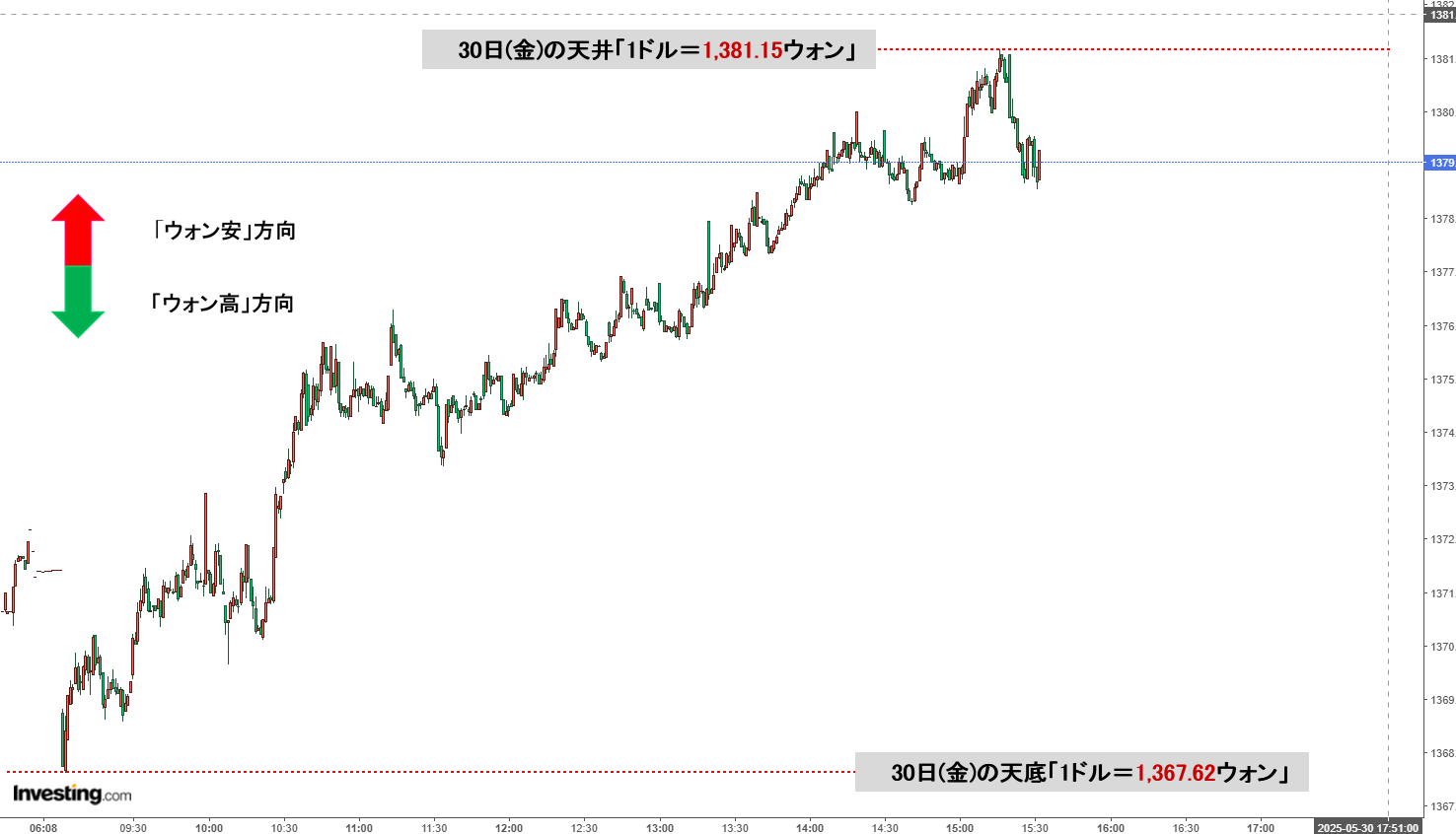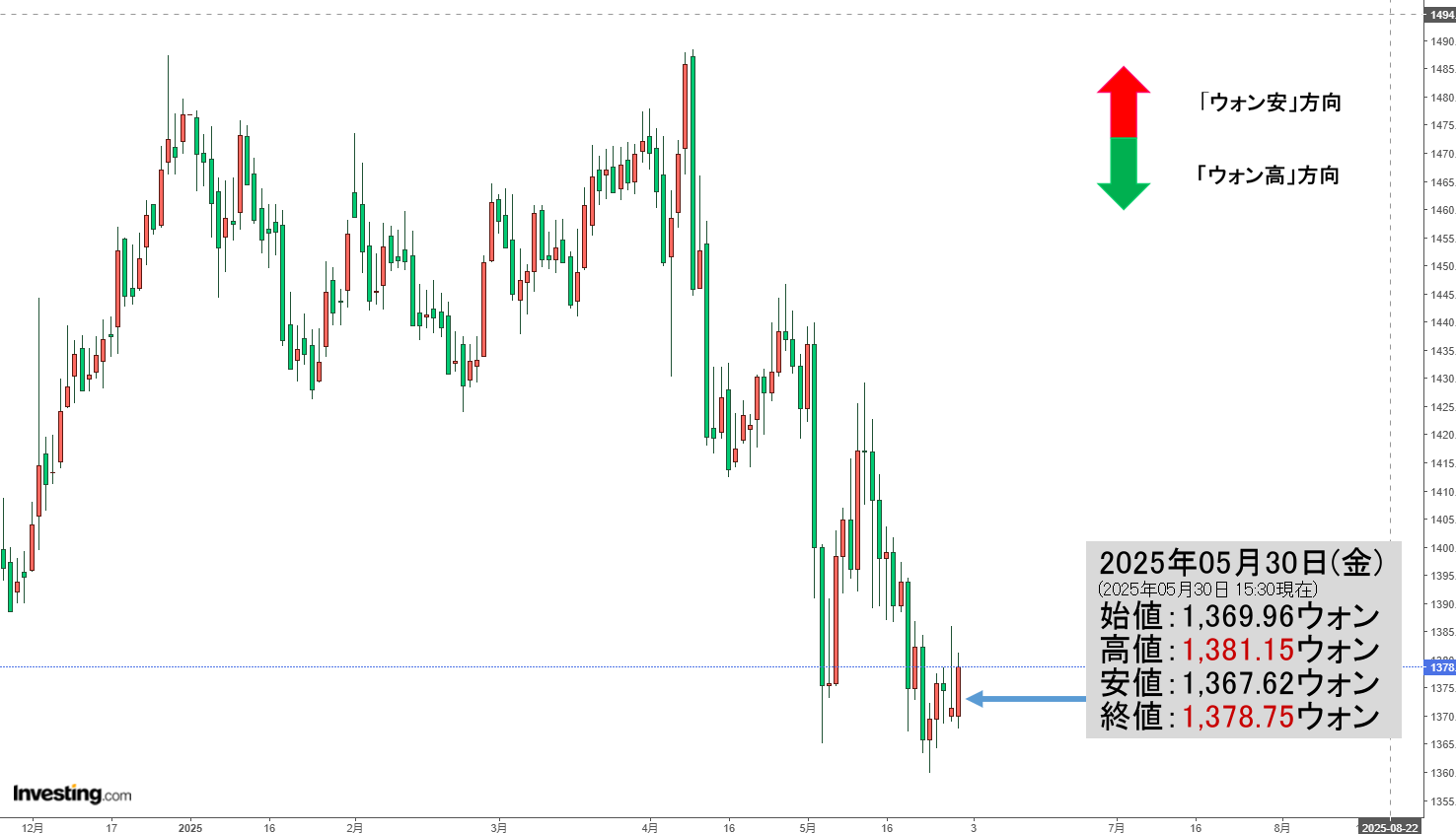 2025年05月30日(金)が(ほぼほぼ)締まりました。2025年05月31日 06:03現在、ドルウォンチャートは以下のようになっています(チャートは『Investing.com』より引用:以下同)。ローソク足1本が1分間の値動きを示す「…