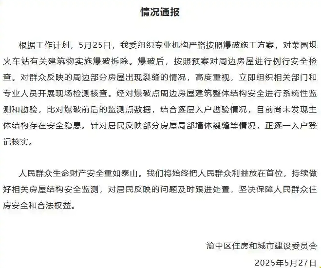 爆破解体後、予めの計画に従って周辺建物に対して例行安全検査を実施したところ、住民から周辺の一部住宅にひび割れが発生したとの指摘を受け、当委員会は重く受け止め、直ちに関連部署と専門技術者を現場に派遣し現場調査と確認を行った。