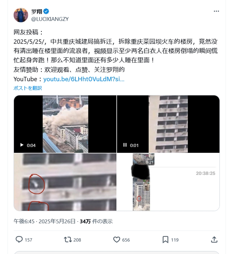 2025年05月25日、 中共重慶都市建設局が取り壊し作業を行い、重慶菜園壩駅の建物を取り壊したが、なんと中で寝ていたホームレスを避難させていなかった。動画には、少なくとも2人の白い服を着た人が建物倒壊の瞬間に慌てて立ち上がって走っている様子が映っている! 中にまだ何人が寝ていたのかは分からない!