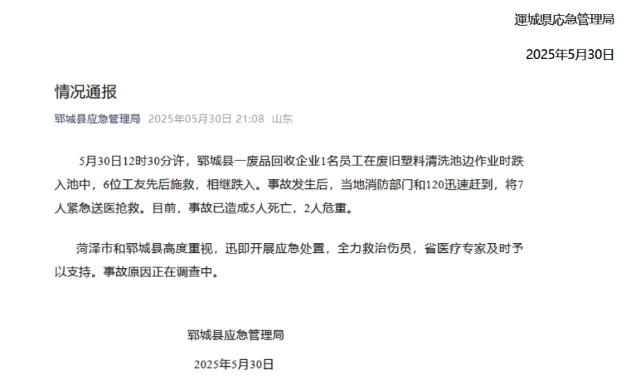 2025年05月30日12:30頃、中国山東省郓城県の廃品回収企業で痛恨の事故が発生しました。以下が当局が出した状況通報です。
