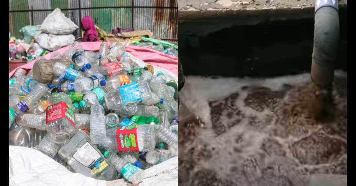 一部の廃プラスチックは、主に苛性ソーダを洗浄剤として用いるため、洗浄後の排水は汚染される。これらはアルカリ性の洗浄剤であり、この廃水は有毒な化学物質を含んでいる可能性がある。