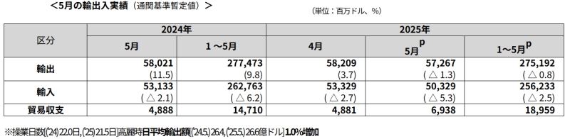 韓国の関税庁が「2025年05月の輸出入動向」のデータを公表しました。