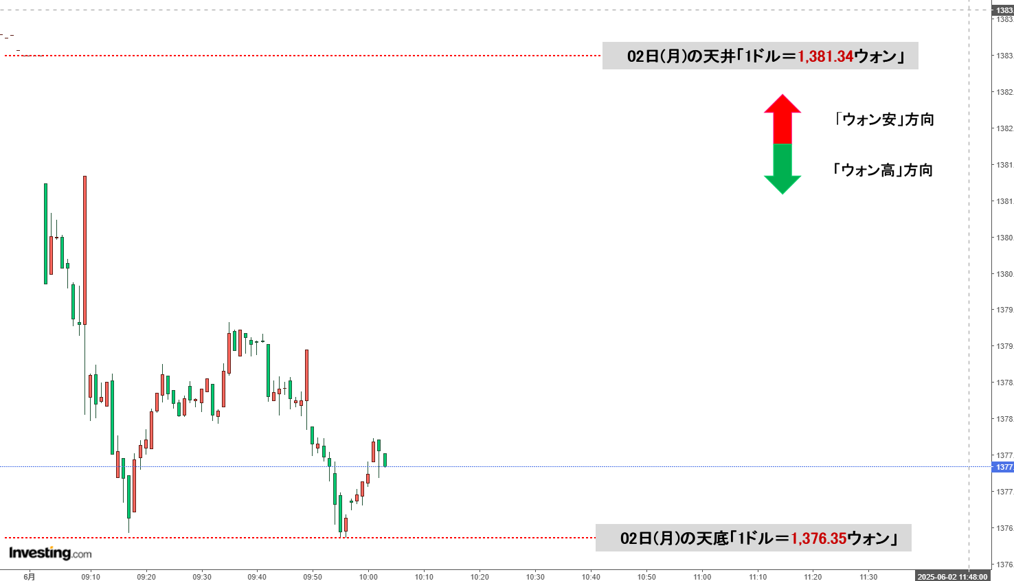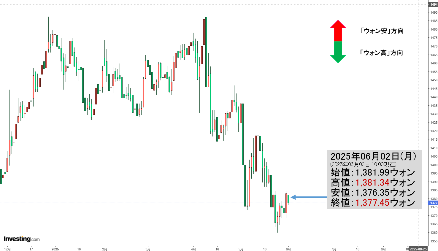 2025年06月02日(月)の市場が開きました。10:00現在、ドルウォンのチャートは以下のようになっています(チャートは『Investing.com』より引用)。