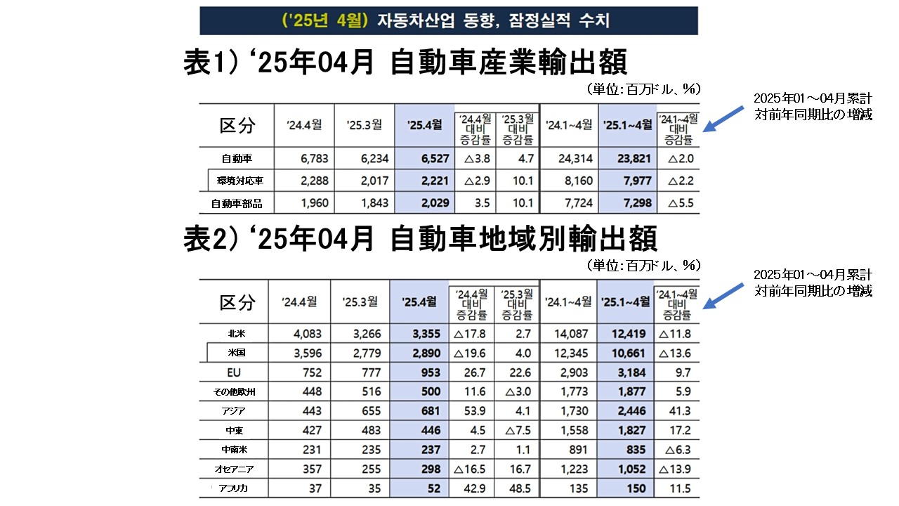 2025年05月20日に産業通商資源部が公表した「2025年04月の自動車産業動向」から概況を示す表組を以下に引きます。