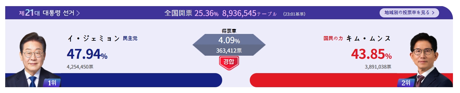 【速報】韓国・大統領選挙「李在明」優勢。11:01現在「47.94%」 広告 トピック X Facebook はてブ Pocket LINE コピー 2025.06.03 おススメ記事 『Money1』 韓国・李在明「薄毛治療を保険適用にしよう」⇒ 年間1,676億もかかる。 『Money1』 日本にすり寄る韓国「韓国と日本は鉱物資源確保で協力すべき」⇒ すべきではない。技術たかりを警戒すべき 『Money1』 韓国政府が「CPTPP加盟を本格的に検討」⇒ 2026年加盟申請を目指す? 『Money1』 韓国・李在明「真実とは無関係に徒党を組んで操作し、対立を激化させ、葛藤を深めることは本当に問題だ」⇒ 自分のことじゃん! 『Money1』 韓国ウォン「対人民元でもドンドン下がる」 『Money1』 韓国ウォンの安値進行は自身の都合。⇒ 1,480寸前で耐えてはいるが 『Money1』 韓国政府「超革新経済」と言い出す ⇒ 李在明の仕業「その4」だ。 『Money1』 韓国「次のパンデミックでは200日以内にワクチンを作る」⇒ またワクチンスワップと言い出すのでは…… 『Money1』 韓国の精油企業の再編 ⇒ 持続可能にしようよ――という話。 『Money1』 韓国「小型衛星の打ち上げ」また不発。煙まで出たが……。 『Money1』 中国「電気自転車の新規格」が国民から大不評。 『Money1』 韓国輸出「半導体が大きく増加:52.7億ドル」+45.9% ⇒ 半導体頼みが進む。 『Money1』 韓国・国民年金との為替スワップを1年延長「650億ドル規模」維持 ⇒ ウォン安阻止に必死。 『Money1』 中国・商務部「不可能なこと」を高らかに宣言 ⇒ いくらスローガンを唱えても消費は増えません。 『Money1』 韓国政府は「統一教会の解散を目指す」⇒ 韓国警察が関連施設捜査に踏み込む。 『Money1』 韓国銀行「日本の経験から学ぶことが出発点」⇒ 中国も「われわれは日本の失敗を研究しているから大丈夫」と言ってましたがドボン状況です 『Money1』 「中国-韓国 商務長官会議」7年ぶり北京で開催「韓国はレアアースについて心配するな」⇒ 韓国を取り込む中国の動き 『Money1』 中国「 何カ月も給与を支払わずに社長が夜逃げ」多発!⇒ 中国人は年末に社長が逃げないよう警戒すべき。 『Money1』 韓国・李在明は「ウソ八百の捏造歴史」を信じているのか? ⇒「古代朝鮮民族はユーラシア大陸の大部分を支配した」という妄想史 『Money1』 韓国「政府負債(D2)」1,270.8兆/対GDP比 49.7% ⇒ ずんずん積み増す。 『Money1』 中国・生産者物価指数「-2.2%」⇒ 「だからデフレだってば」 『Money1』 韓国・李在明「オレの名前を“罪名”と書くヤツがいる」⇒ それでも漢字教育は見送り。 『Money1』 韓国株式市場から91億ドル流出! 債券市場は過去最大の資金流入「118億ドル」 『Money1』 韓国ウォンは最弱の通貨「10月 ⇒ 12月10日:-3.1%」 『Money1』 中国の総穀物生産量がまた増えた「7億1,488万トン」⇒ 過去最高を更新し続ける神話。本当に? 『Money1』 韓国「韓国が通貨危機に陥る確率は30%程度」⇒ 米国・日本との通貨スワップを再開拡大すべき 『Money1』 韓国政府「韓国型SWFを2026年上半期に造るぞ!」⇒ 何それ。目的の一つはウォン安阻止と見られる 『Money1』 韓国・政府負債をずんずん積み増す李在明の政府 ⇒ 1,175兆まで来た 『Money1』 韓国・光州「図書館」建設現場「突然崩落事故」 『Money1』 韓国政府「国民年金は外貨建て債券を発行してドルを自前で調達すればいいじゃん」⇒ 国民の資産をリスクにさらす暴挙。 『Money1』 韓国10月国際収支に現れた「大笑いな現状」⇒ 証券投資で1,171億ドル!なんだこりゃ。ウォン安が進行しても無理はない 『Money1』 韓国・次の「日本ゆすり・たかり」ネタ。 『Money1』 韓国・李在明「韓国史上最大の支出予算 727.9兆」確定 ⇒ 上半期に75%を配分する 『Money1』 「韓国政府は徳政令を出すべき」なのか――驚愕の記事。 『Money1』 韓国「自称・超能力者にして神人(ヅラ疑惑)」追加で拘束延長! 『Money1』 『韓国銀行』李総裁「韓国はゼロ%成長に落ち込む」⇒ 韓国は下り坂。 Fact1 日本の誇る海洋資源調査船『白嶺』は先進技術の塊! Fact1 夏の甲子園、優勝校を最も多く輩出している都道府県とは? Fact1 今話題の「楽天ライオンズ」とは? Fact1 奇跡の毛色「白毛馬」とは? Fact1 全て勝つといくら? 競馬GI競走で勝利騎手がもらえる賞金とは? Fact1 平成仮面ライダーの意外すぎるモチーフとは? Fact1 発表から2日で大崩壊、鳴かず飛ばずに終わりそうなスーパーリーグとは? Fact1 日本人マスターズ挑戦の歴史。松山以前に最高位だった選手とは? Fact1 甲子園通算本塁打、最多の清原に次いで多く打っている意外な選手とは? Fact1 セレクトセールの高額取引馬が稼いだ金額とは? 2025年06月03日、11:01現在、開票率25.36%で、韓国大統領選挙で『共に民主党』統一候補李在明(イ・ジェミョン)さんが優勢で47.94%となっています。 ↑李在明(イ・ジェミョン)優勢に喜ぶ『共に民主党』の皆さん。前列中央は李在明(イ・ジェミョン)の腰巾着・朴贊大(パク・チャンデ)。 (吉田ハンチング@dcp) 広告