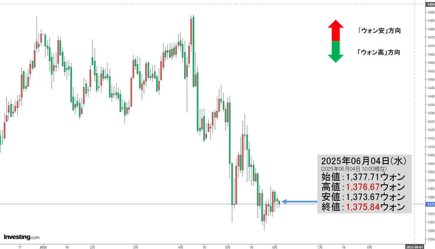 2025年06月04日(水)15:30現在、ドルウォンのチャートは以下のようになっています(チャートは『Investing.com』より引用)。陰線が伸びて「1ドル=1,370ウォン」を割りました。現在のところ「1ドル=1,369ウォン」近...