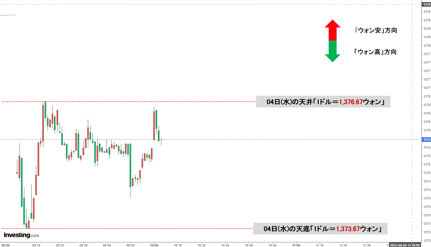 2025年06月04日(水)の市場が開きました。10:00現在、ドルウォンのチャートは以下のようになっています(チャートは『Investing.com』より引用)。