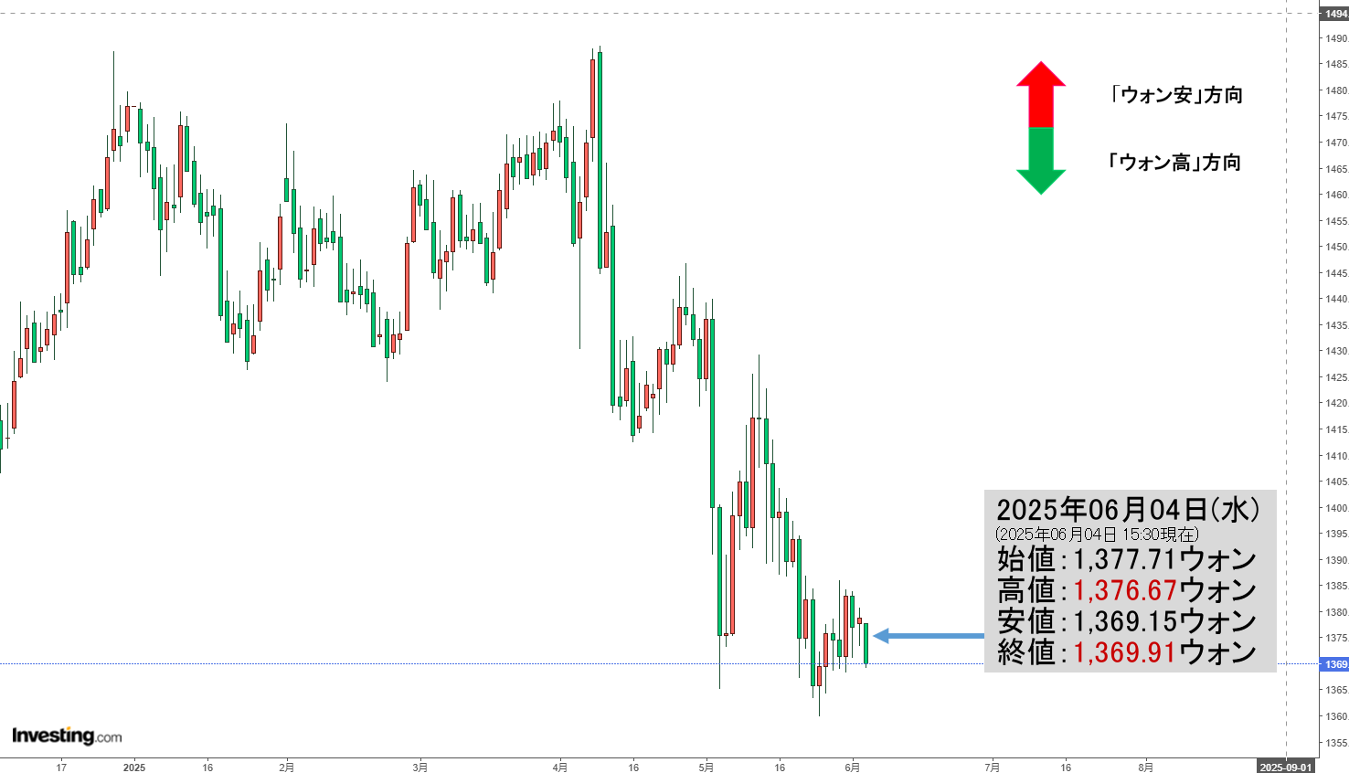 2025年06月04日(水)15:30現在、ドルウォンのチャートは以下のようになっています(チャートは『Investing.com』より引用)。