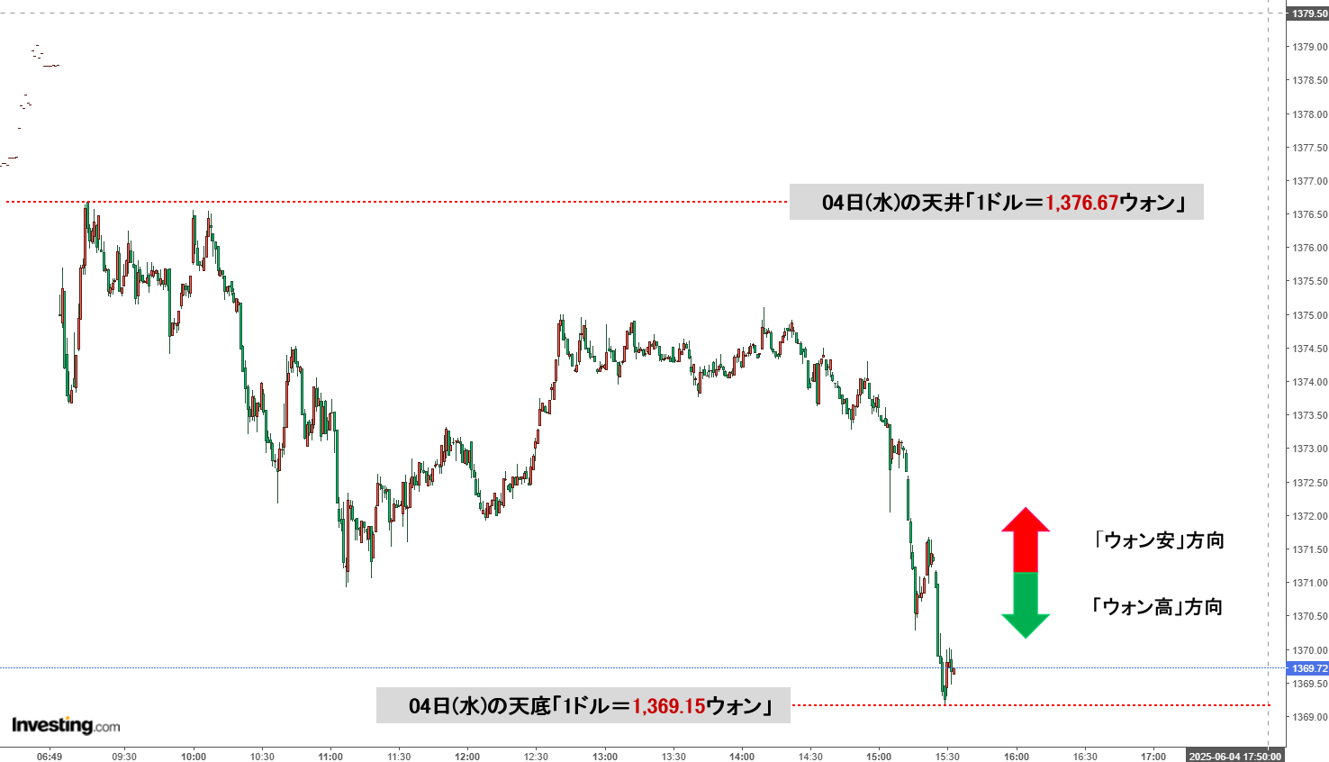 「ドルウォン」06月05日(木)初動・「1,356ウォン」ウォン高へ進行。