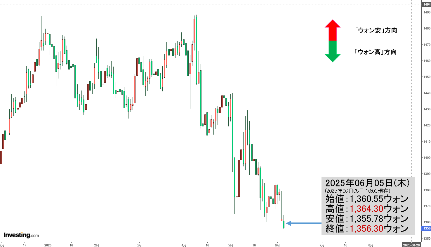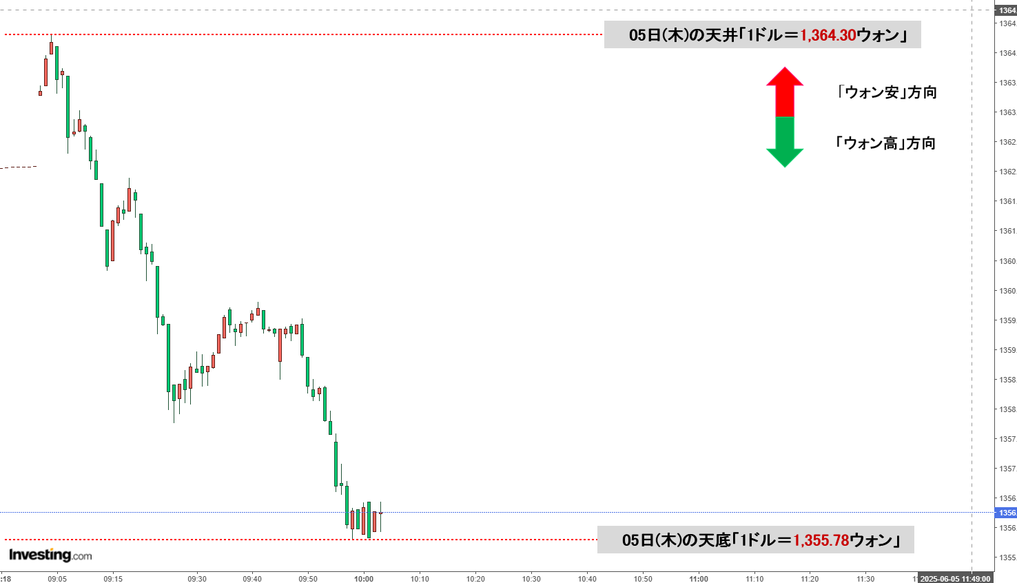 2025年06月05日(木)の市場が開きました。10:00現在、ドルウォンのチャートは以下のようになっています(チャートは『Investing.com』より引用)。