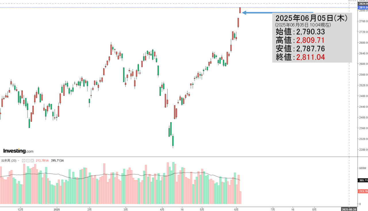 ギャップアップして始まりました。KOSPIは「2,811」まで上昇しています。新大統領に就任した李在明(イ・ジェミョン)さんは「KOSPIは5,000までいく」と唱えていましたので、いくといいですね。