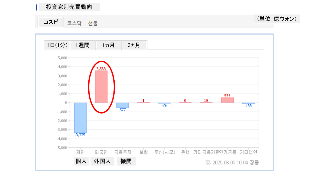 個人投資家は「3,335億ウォン」の売り越し。一方の外国人投資家は「3,563億ウォン」の買い越しです。
