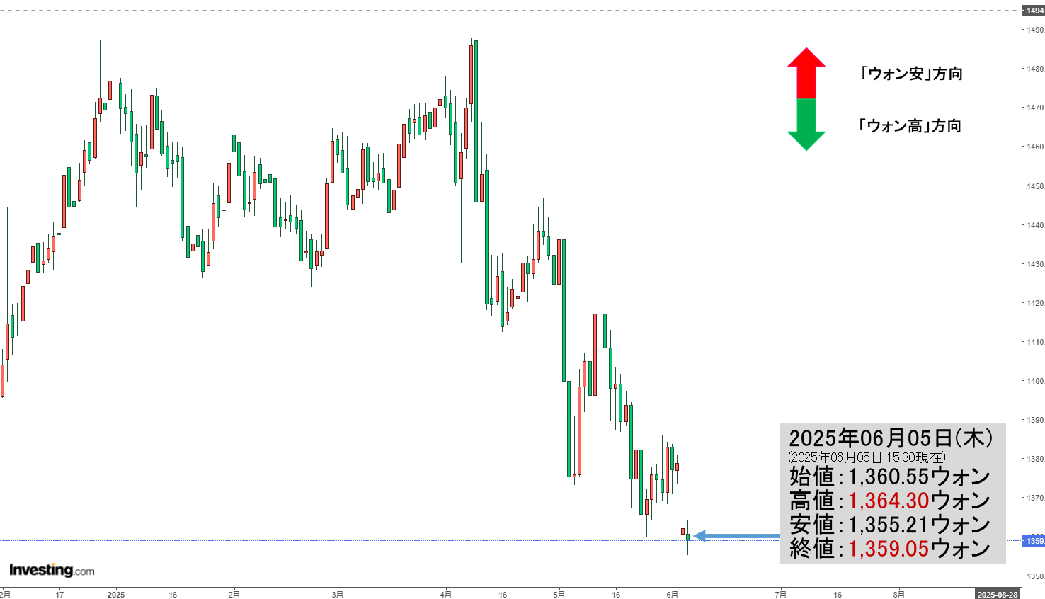 現在のところ「1ドル=1,359ウォン」近辺の攻防となっています。「1ドル=1,360ウォン」を割っています。