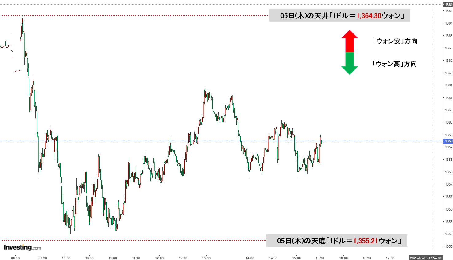 2025年06月05日(木)15:30現在、ドルウォンのチャートは以下のようになっています(チャートは『Investing.com』より引用)。