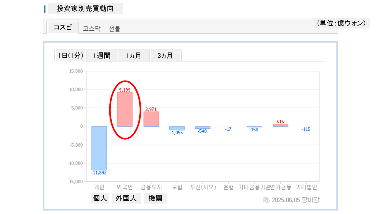 個人投資家は「1兆1,892億ウォン」の売り越し。一方の外国人投資家は「9,199億ウォン」の買い越しです。