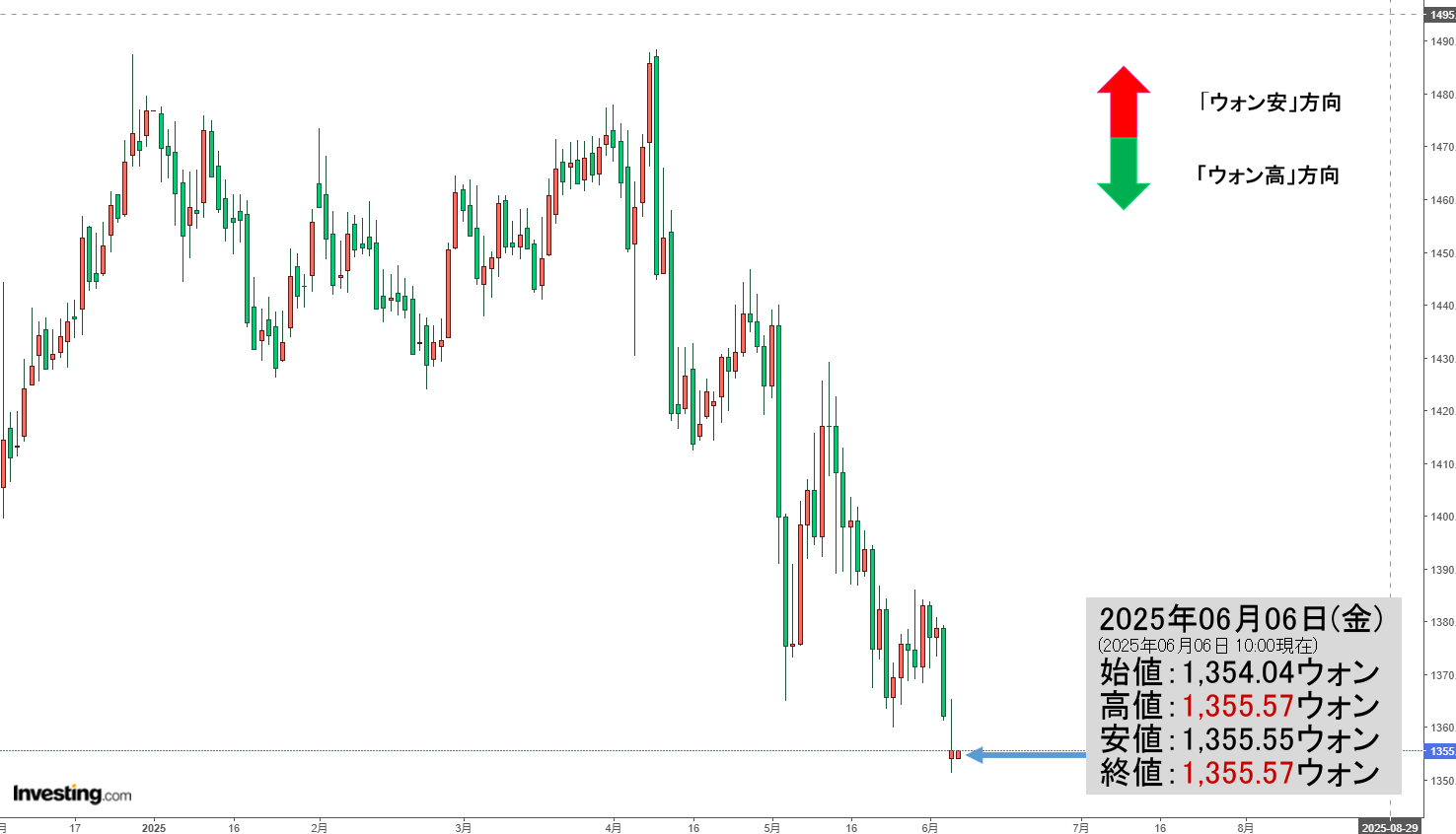 2025年06月06日(金)の市場が開きました。10:00現在、ドルウォンのチャートは以下のようになっています(チャートは『Investing.com』より引用)。