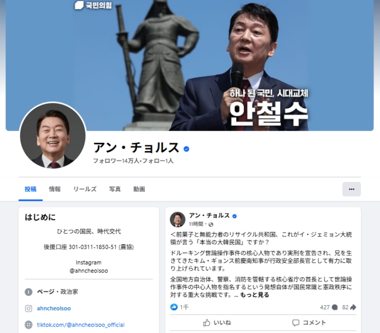 また前科者かよ――という話ですが、『国民の力』の安哲秀(アン・チョルス)さんが、2025年06月08日、Facebookに面白い李在明(イ・ジェミョン)政権批判を行いました。