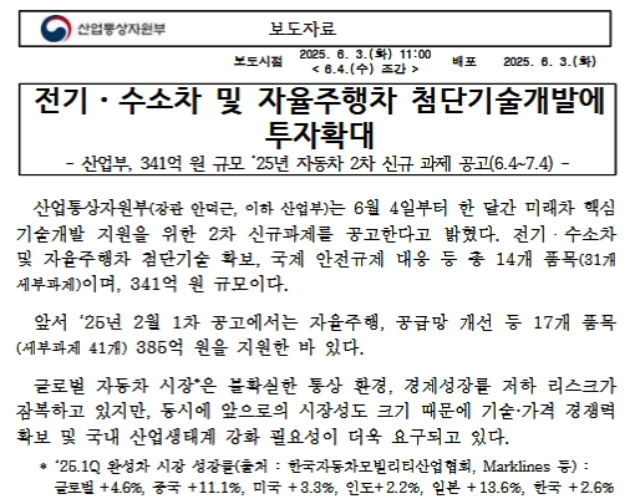 産業通商資源部のこのようなリリースを出すというのは、まさに断末魔の悲鳴のようなものです。「電気・水素車および自律走行車の先端技術開発に341億ウォン」――たったの34億円です。