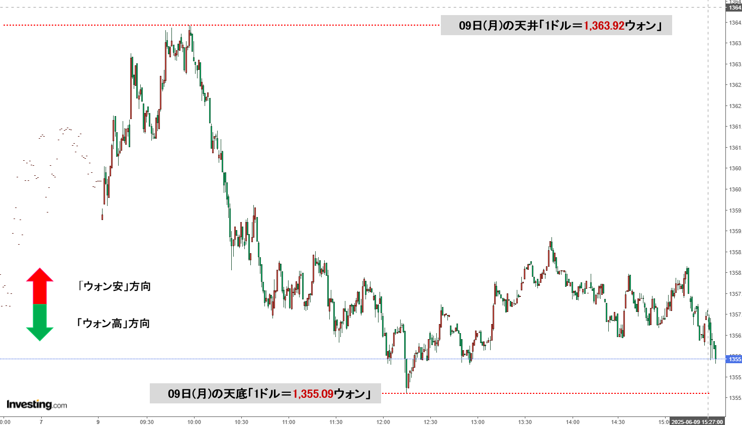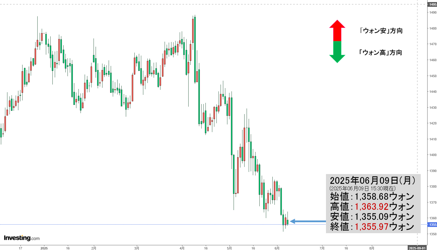 現在のところ「1ドル=1,355ウォン」近辺の攻防となっています。