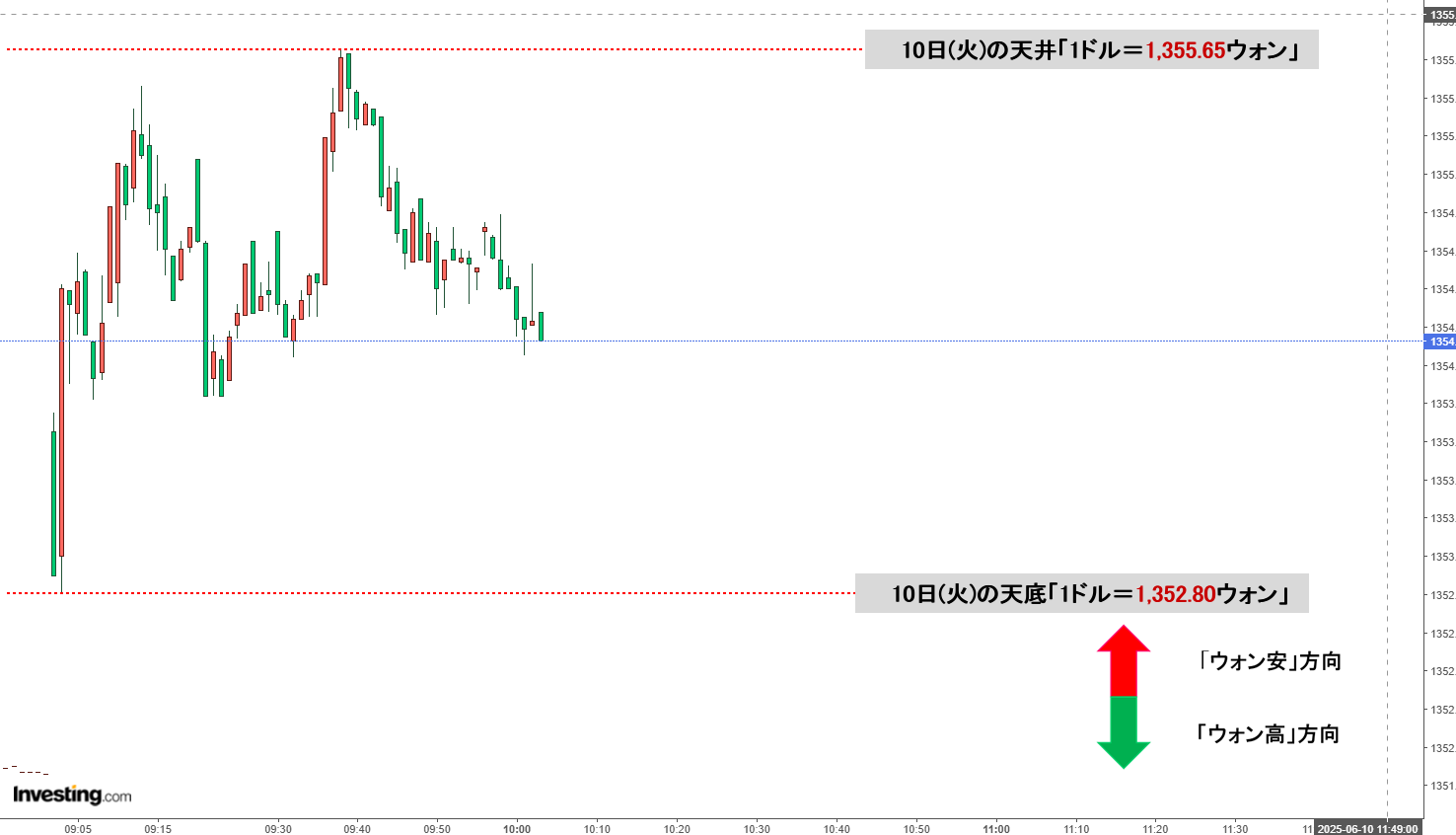 2025年06月10日(火)の市場が開きました。10:00現在、ドルウォンのチャートは以下のようになっています(チャートは『Investing.com』より引用)。