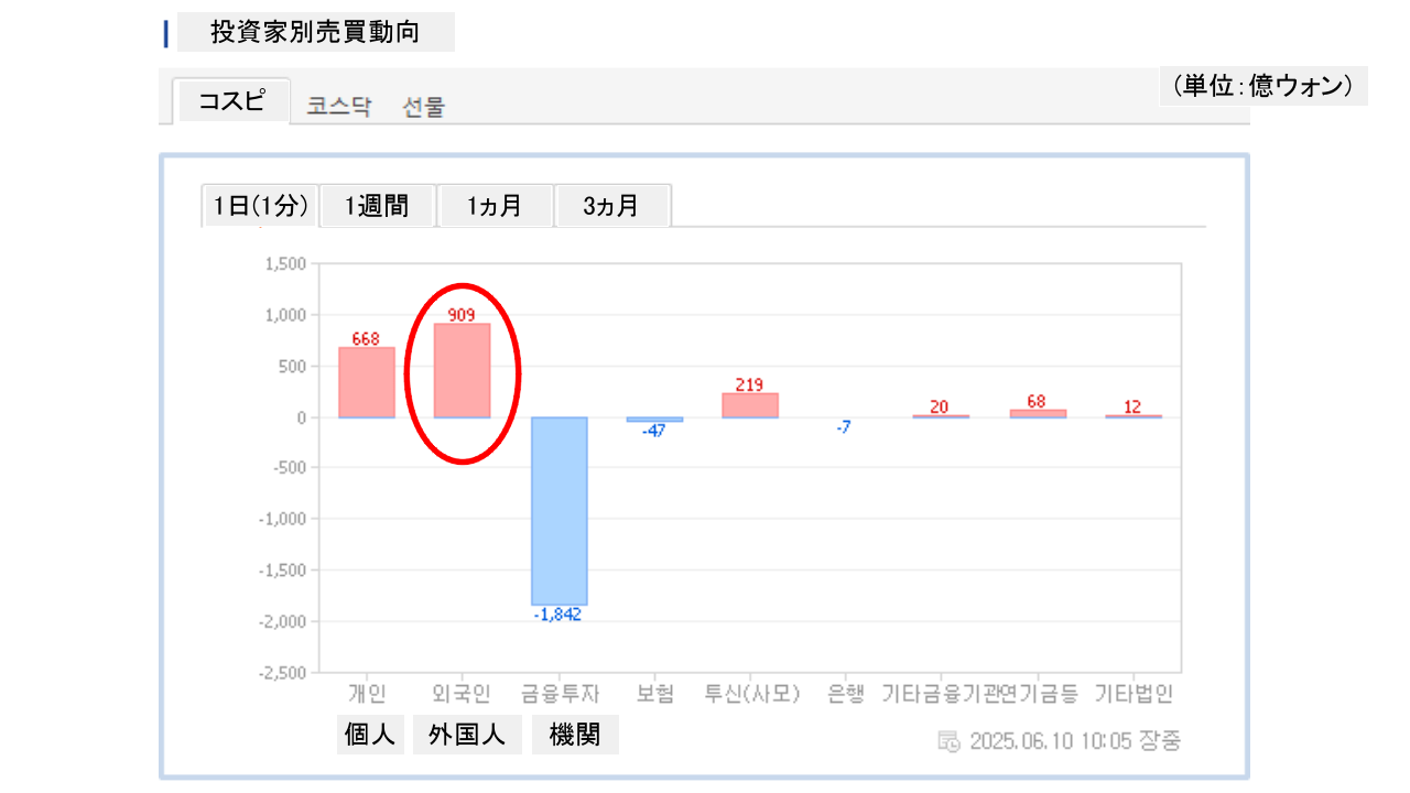個人投資家は「668億ウォン」の買い越し。一方の外国人投資家は「909億ウォン」の買い越しです。