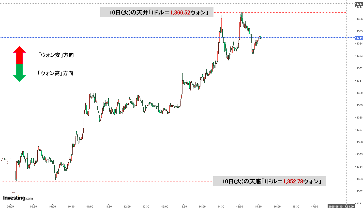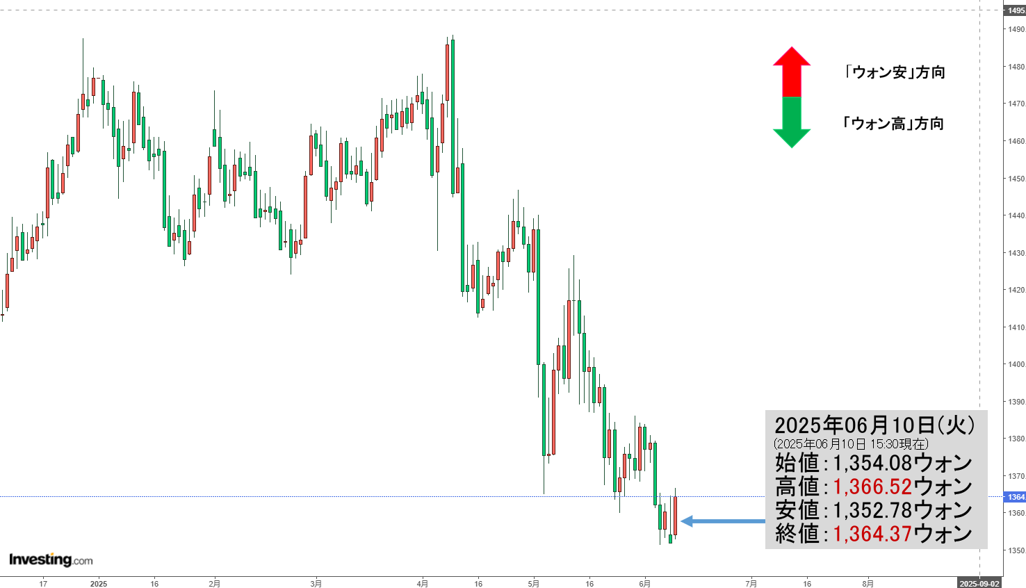 2025年06月11日(水)の市場が開きました。10:00現在、ドルウォンのチャートは以下のようになっています(チャートは『Investing.com』より引用)。前日は陰線となりましたが、とりあえずは上げました。「1ドル=1,360ウォン...
