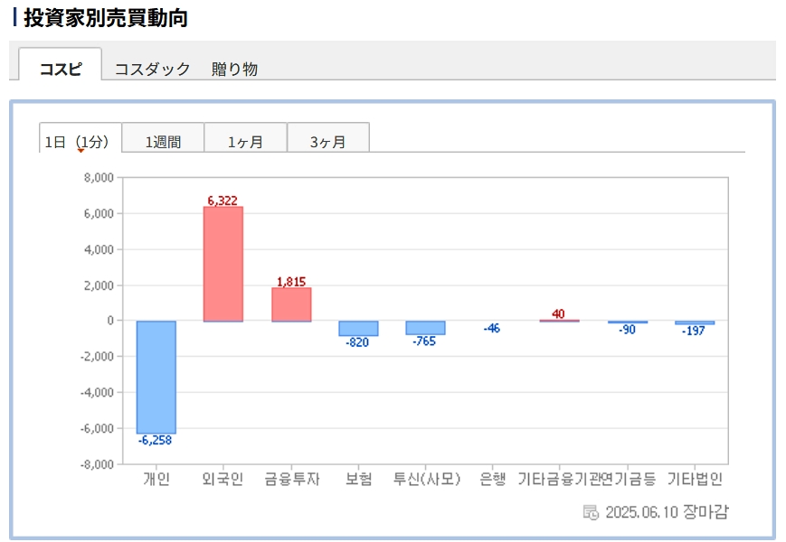 個人投資家は「6,258億ウォン」の売り越し。一方の外国人投資家は「6,322億ウォン」の買い越しです。