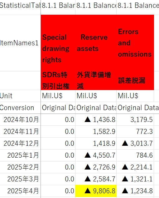 ↑黄色でフォーカスしているのが2025年04月の外貨準備の増減。「-98億680万ドル」です。⇒データ出典:『韓国銀行』公式サイト「ECOS」