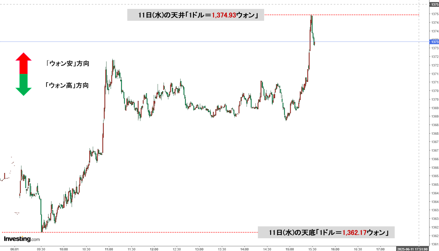 2025年06月11日(水)15:30現在、ドルウォンのチャートは以下のようになっています(チャートは『Investing.com』より引用)。