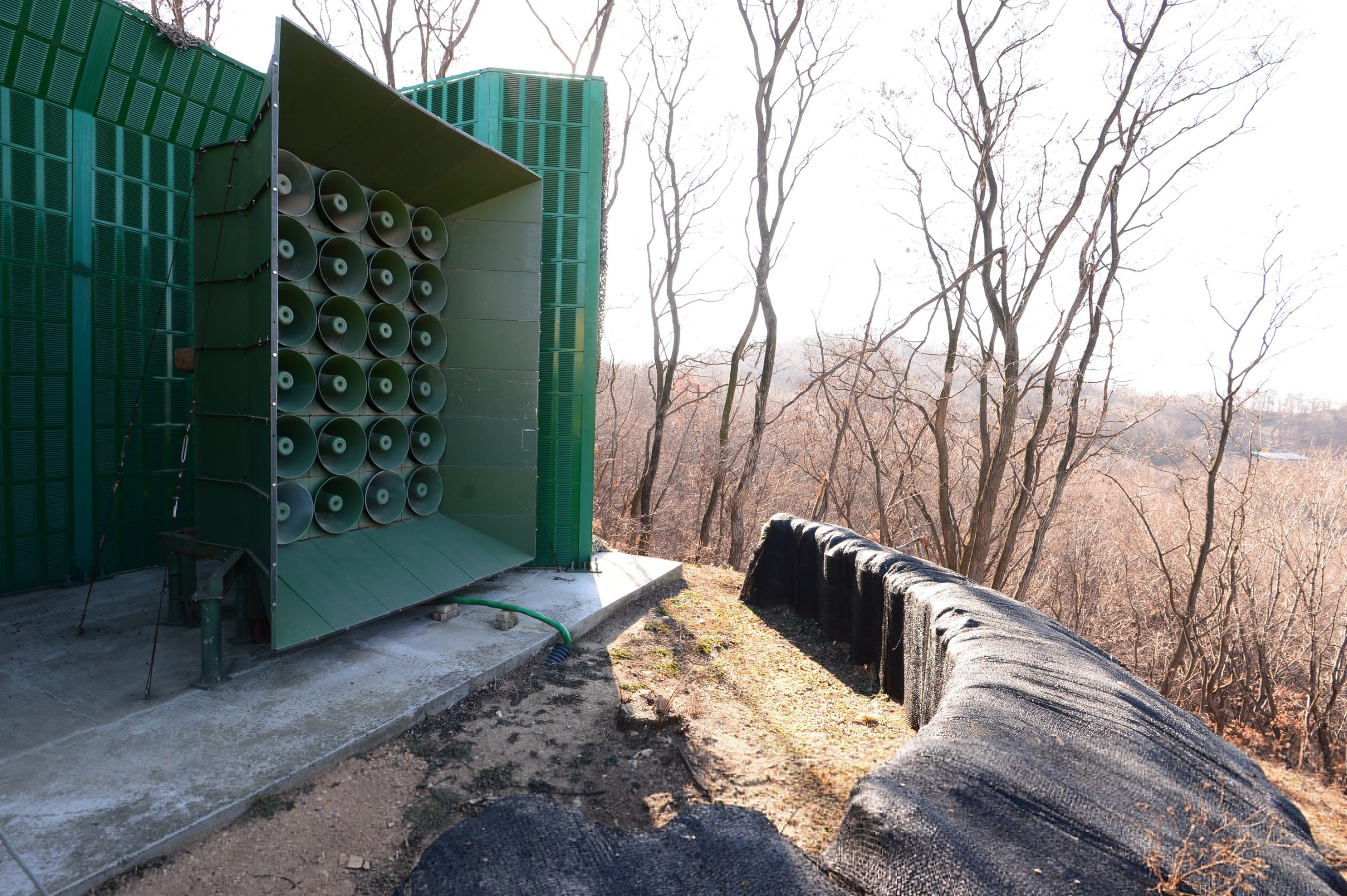 ↑前線に配置された拡声器放送の拠点。尹錫悦(ユン・ソギョル)大統領が6年ぶりのに放送を再開させたのが李在明(イ・ジェミョン)によって中止されました。
