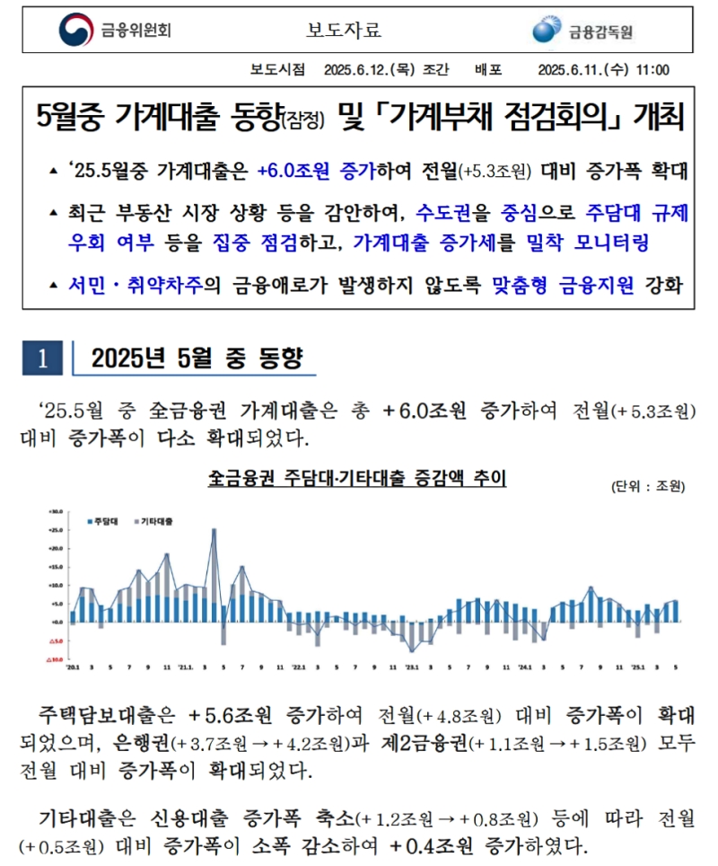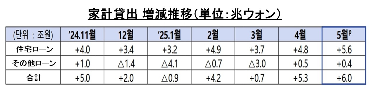 2025年5月の家計貸出は:前月比 +6.0兆ウォン増加(前月比 +5.3兆ウォン増)、増加幅が拡大最近の不動産市場動向などを踏まえ、首都圏を中心に住宅ローン規制の緩和有無などを重点点検