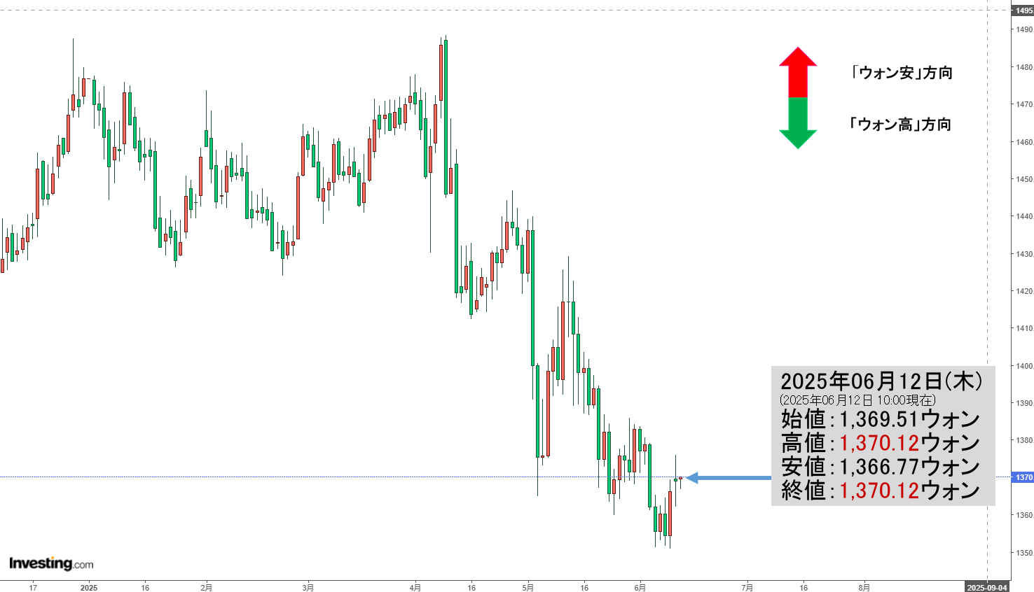 2025年06月12日(木)15:30現在、ドルウォンのチャートは以下のようになっています(チャートは『Investing.com』より引用)。陰線が伸びました(笑)。「1ドル=1,360ウォン」割れです。現在のところ「1ドル=1,358ウ...